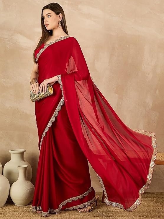 Women’s Satin Chiffon Sequence Work Embroidery Lace Border Plain Solid Saree